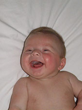 At around 4.30 Lucy was able to check me again to see how I'd progressed, it was at this point it all got a bit more intense as Lucy could see that the registrar hadn't fully broken my waters and therefore despite all the strong contractions I was still only 5cm dilated. This new's was so disapointing as we all felt I was nearly there which I was really excited about. Lucy then broke my waters but I was upset feeling I still had hours to go. Because I was upset I lost the focus on my breathing and started to find the surges really intense. At this point the wimp in me (or so I thought) came out and I put my hands up saying, I'm no hero, I can't do this for another 5 or 6 hours and asked for an epidural. It took about 40 minutes for the epidural to be administered and as it started to take effect I got the urge to push, Lucy checked me again and was amazed to find that I was now fully dilated. I was disapointed then that I'd had the epidural as had I known it'd be so quick I would have carried on but no one expected me to dilate 5 cm's in half an hour - hence the rather intense surges! The epidural also slowed the process and the surges became further apart and less intense, after having a drip to bring the contractions back on I was ready to push at around 7.30pm. Again, having had the epidural this numbed the sensations and after an hour the registrar was called in to assess the situation. It was decided that forceps should be used and an episiotomy was performed which again I knew wouldn't have been needed if I hadn't had the epidural. Still it was necessary to help Tom out and I was still very calm and relaxed all the way through. Tom was born at 9.04pm, 18.5hrs since the first surges but the time had flown by. He was placed on my tummy so we could see for ourselves that it was a boy, he weighed 6lb 5oz which was great for 5 weeks premature. He'd had the umbilical cord wrapped around his neck and was taken away to be given a little oxygen and also put on a drip with antibiotics due to my waters breaking early but he was back with his dad and I not long after and we couldn't believe how beautiful and perfect he was. Tom's 5 months old now but right from the start he has been a very happy contended baby, he rarely cry's and is always laughing and smiling.